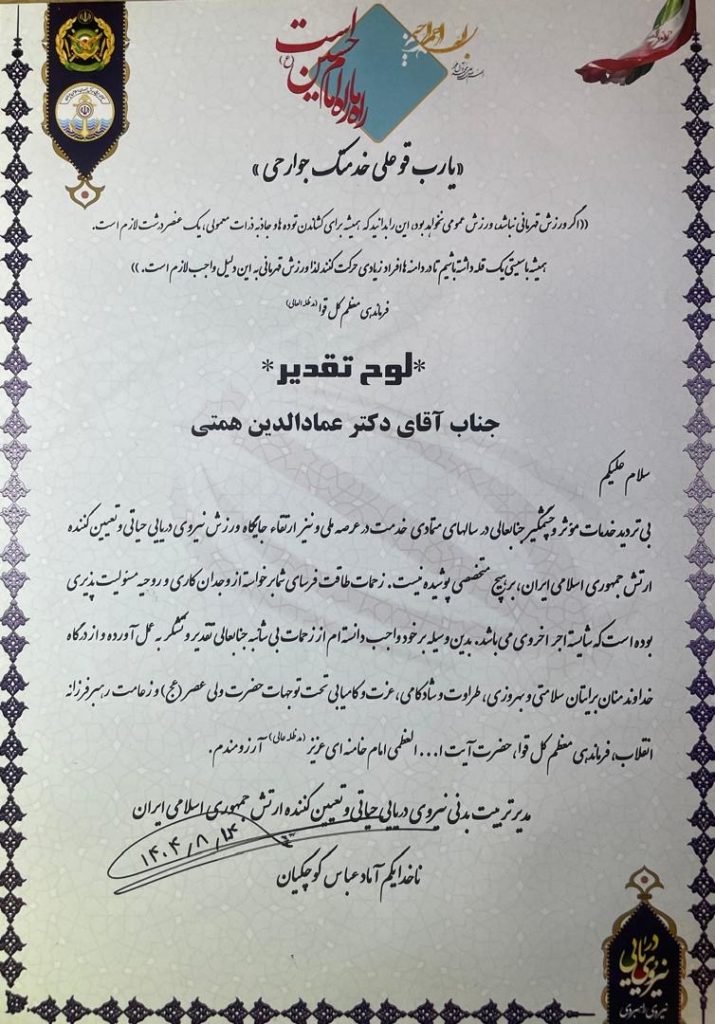 در حاشیه مسابقات قهرمانی شنای پایوران نیروی دریایی ارتش جمهوری اسلامی ایران که روز جمعه ۱۶ آبان‌ماه در مرکز آموزش تخصص‌های دریایی رشت برگزار شد، فرمانده نیروی دریایی ارتش با اهدای لوح تقدیر از عماد همتی، رئیس هیأت ورزش‌های آبی استان گیلان، تجلیل کرد.